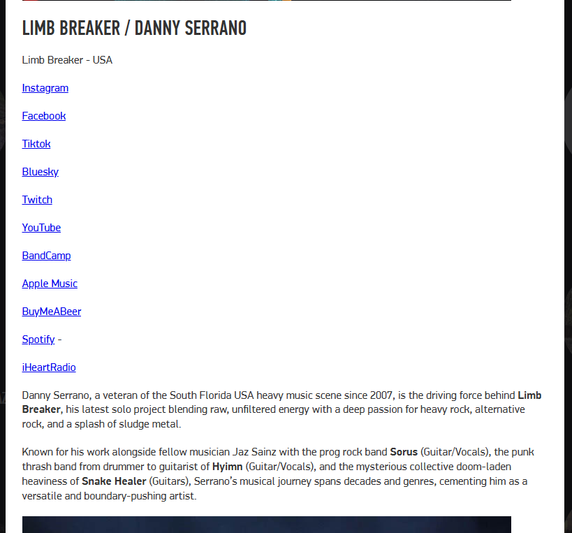 LIMB BREAKER, the solo grunge-doom project from South Florida’s Danny Serrano, formed out of sheer necessity — a raw, distorted answer to modern rock’s clean sheen. Rooted in the DIY ethics of 90s underground noise and the heavy dissonance of doom, Limb Breaker crafts an unsettling blend of fuzz, glitch, and melody that hits like a punch to the teeth.